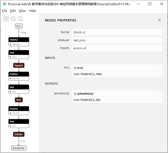 前面章节中,我们训练了多入多出的三层神经网络来完成MNIST数据集的识别数字任务,现在就可以动手把训练好的网络保存为ONNX格式的模型文件。