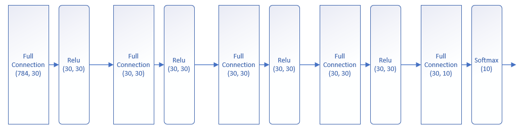 这个网络有5个全连接层,前4个全连接层后接ReLU激活函数层,最后一个全连接层接Softmax分类函数做10分类。由于我们在第14章就已经搭建好了深度神经网络的Mini框架,所以可以简单地搭建这个网络,如下代码所示: