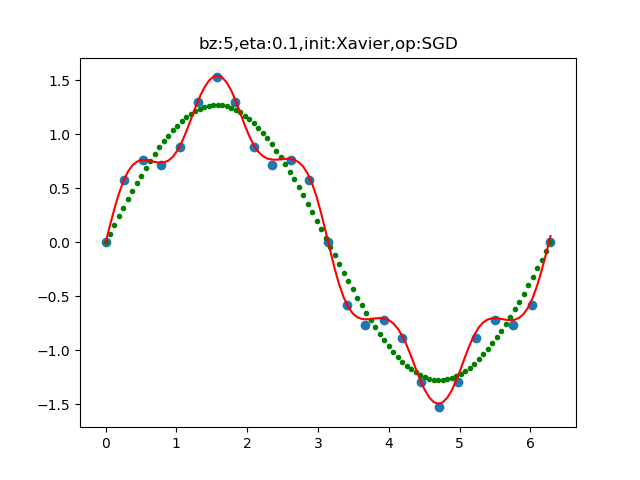 其中,绿色的点是公式1的第一部分的结果,蓝色的点是整个公式1的结果。我们可以把绿色的点作为测试/验证基线,可以看到它是一条标准的正弦曲线。而蓝色的点作为带噪音的训练样本,该训练样本只有25个数据。
